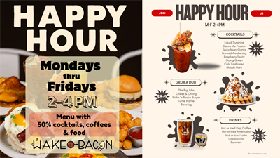 Wake ’n Bacon Happy Hour is the perfect weekday pick me up. Join us for 50% off cocktails, coffees, and food from 2 to 4 PM. Sip our signature drinks, enjoy your favorite brunch bites, and relax in our colorful, Instagram loved space in the heart of Lakeview. Bring friends, coworkers, or the whole crew for an afternoon treat that feels fun and affordable.